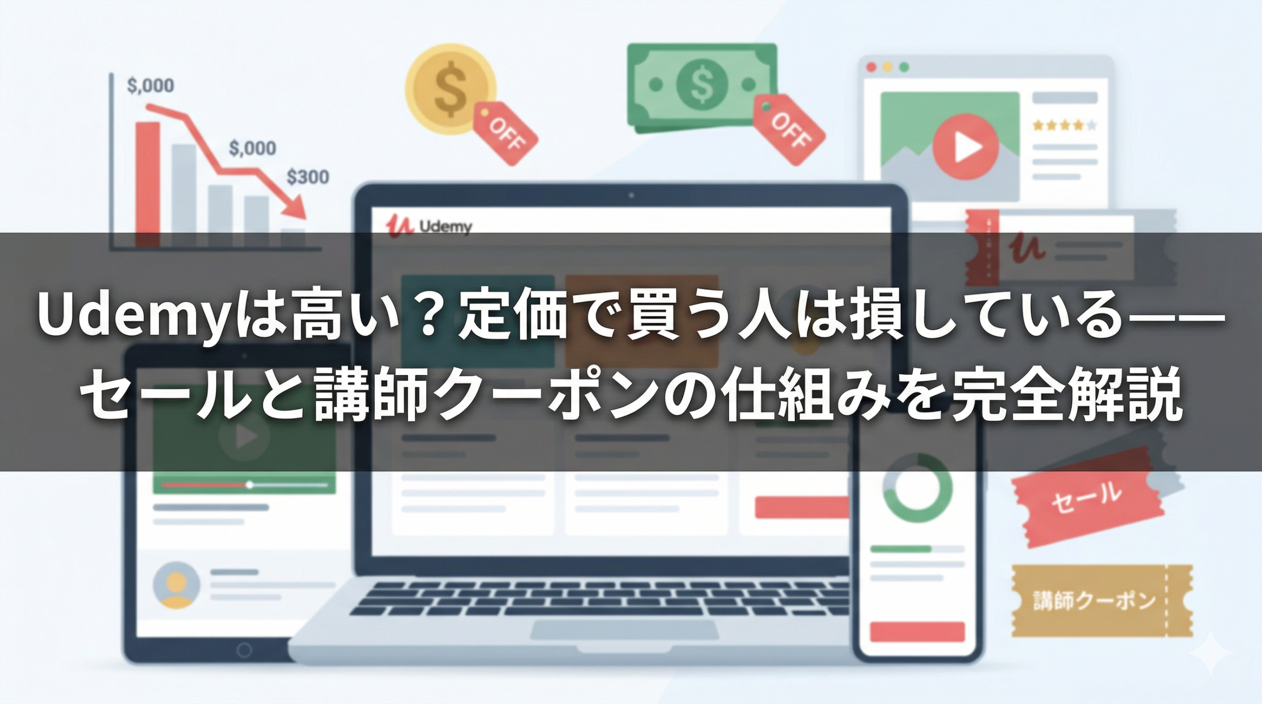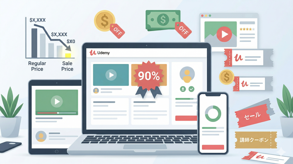 この記事では、Udemyの価格の仕組み・セールの頻度・セール以外の割引手段を徹底解説します。「Udemyは高い」と感じて購入をためらっている方は、この記事を読んでから判断してください。